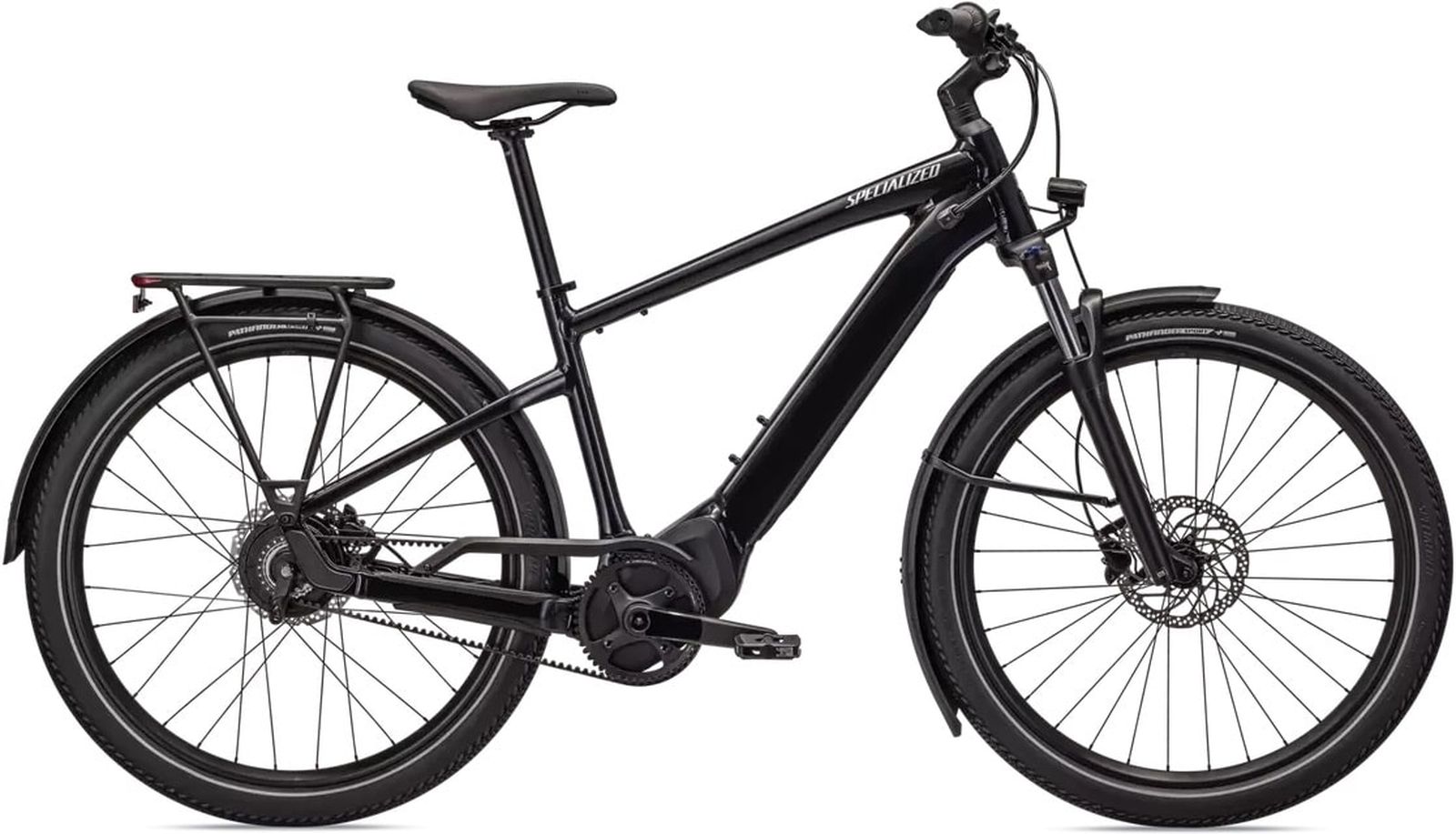 Specialized E5 Aluminum, bottom bracket motor mount, fully integrated &lockable downtube battery, internal cable routing, lock and front rack mount, sliding dropout